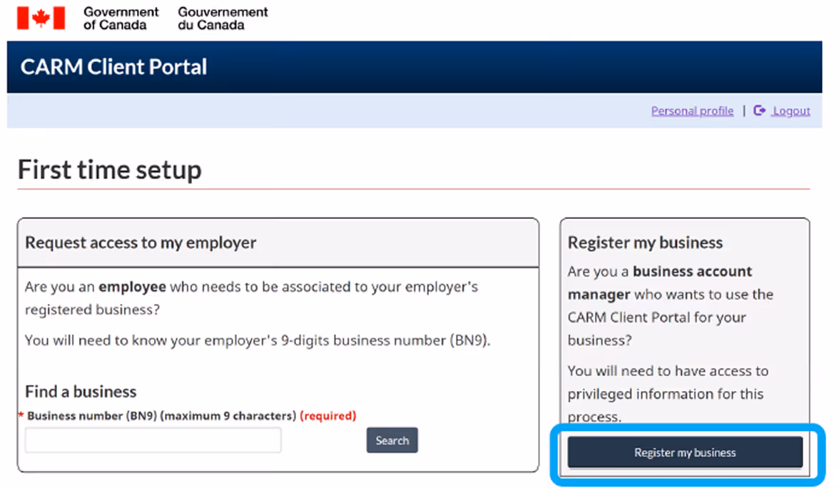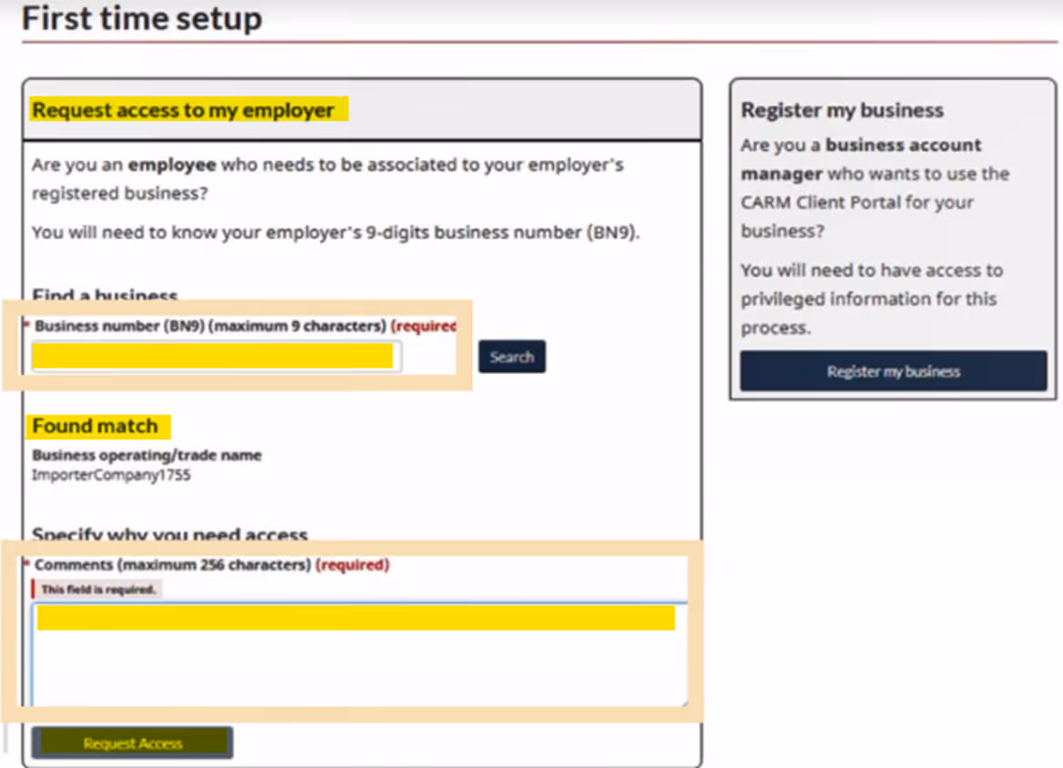- All other users should select “Employee Access Request”, provide the 9-digit Business Number, and wait for Business Account Manager (BAM) approval.